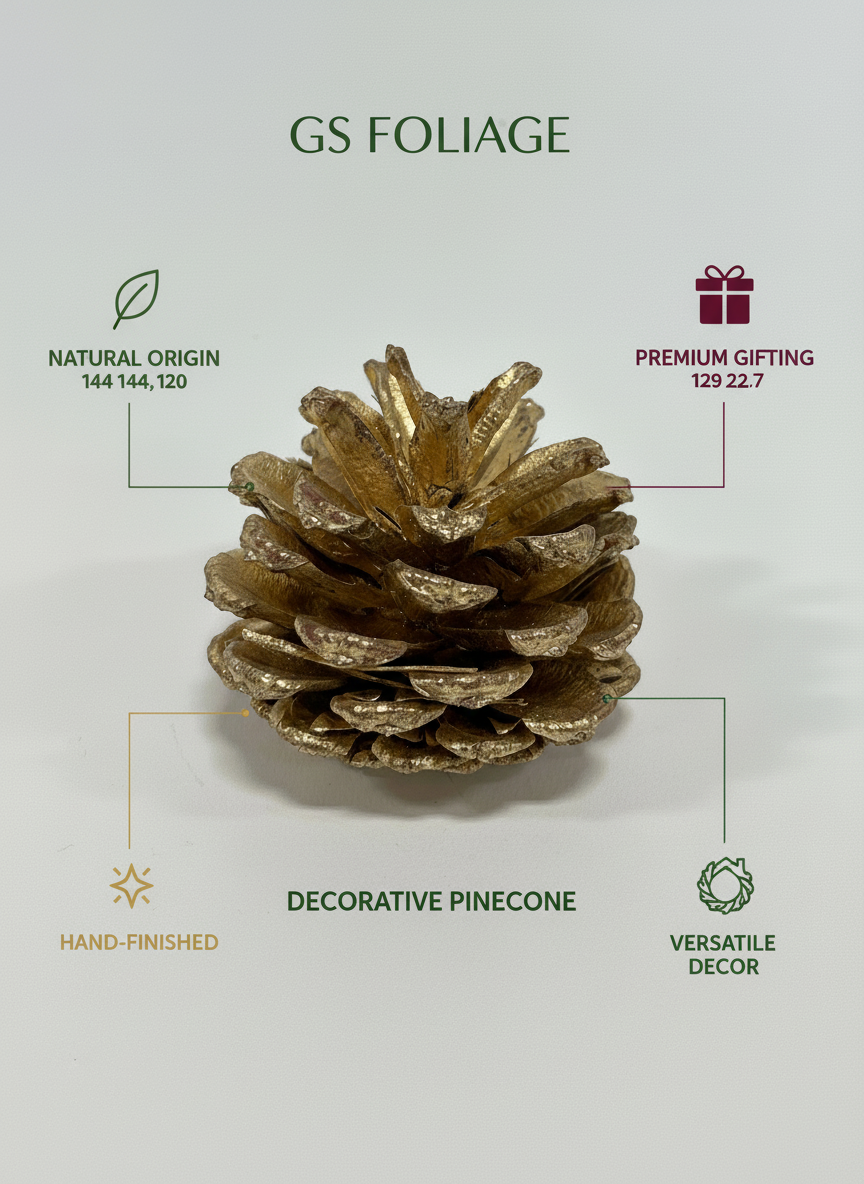 Indulge in nature's elegance with GS Foliage's Gold Painted Jersey Pinecones (1"-2") Set of 24. Born from a deep-rooted passion for the natural world, these pinecones are carefully selected and meticulously curated. Each one is a testament to nature's artistry, transformed into an extraordinary piece of dried/pressed flowers. Infused with a touch of modern elegance, these pinecones are not just ordinary elements but a one-of-a-kind masterpiece. Whether you seek a subtle accent or a bold statement, these gold-painted pinecones will add a touch of nature's magic to your home, office, or special event. Add a touch of the forest into your life with GS Foliage.